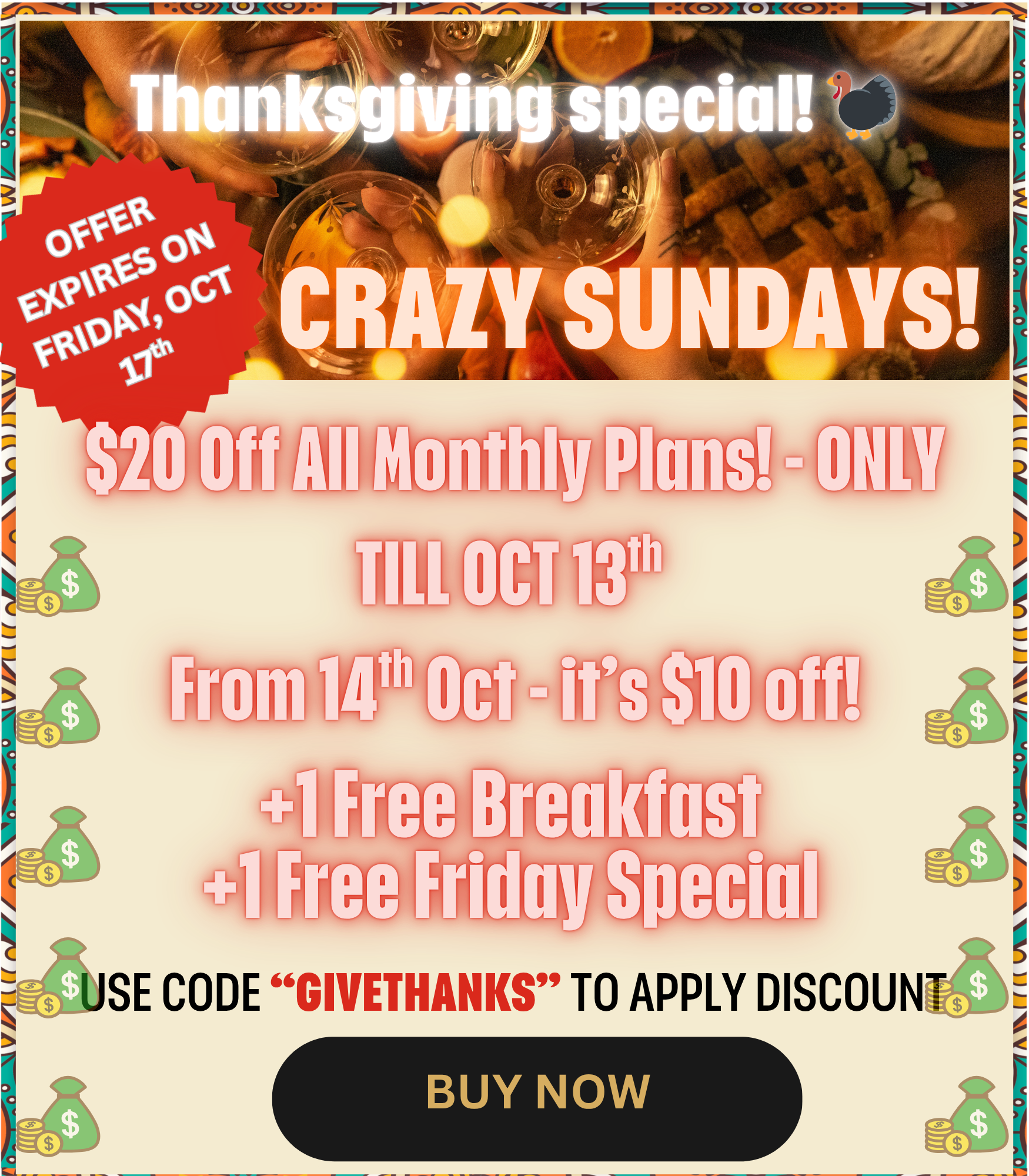 Get $20 OFF ALL MONTHLY PLANS +1 FREE BREAKFAST + 1 FREE FRIDAY SPECIAL - USE CODE GIVETHANKS at checkout - Offer ends on Monday, Oct 13th